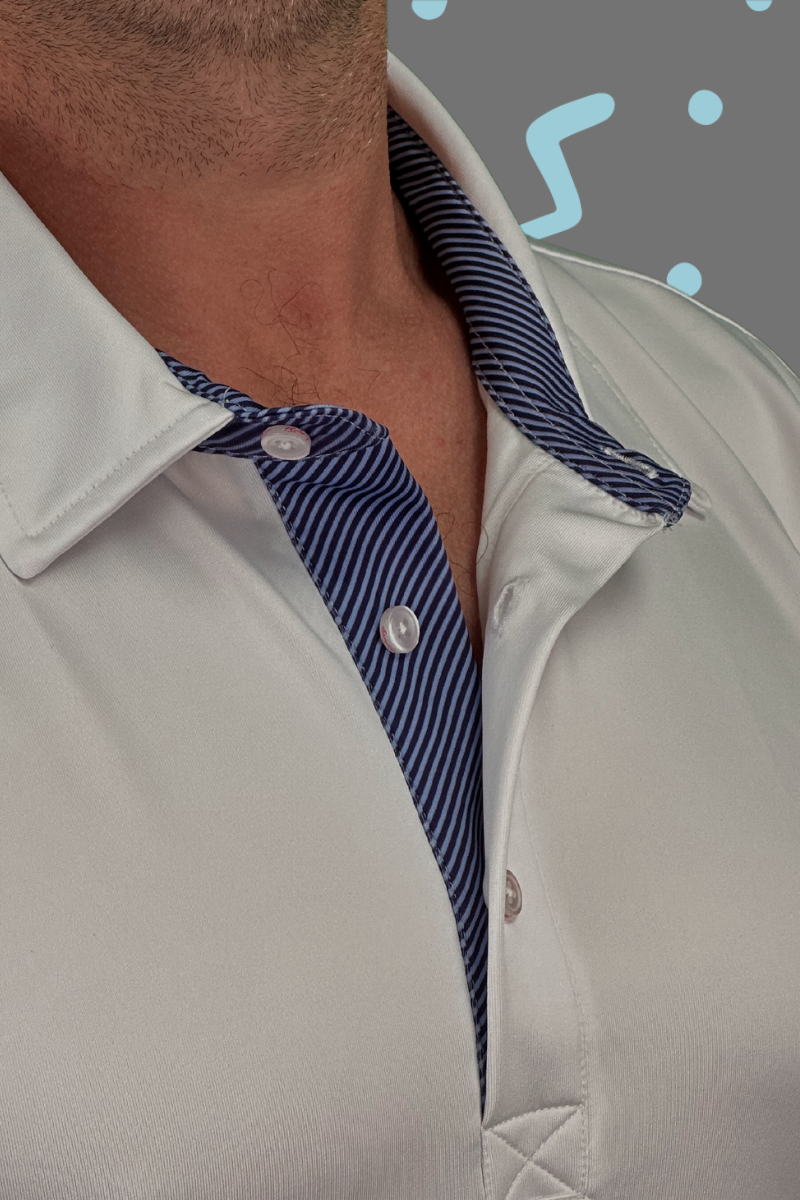 Look sharp and stay comfortable. This polo has bold blue-striped accents on the collar, placket, and hem slits. Constructed using moisture-wicking performance fabric, this top is designed to keep you cool and collected no matter what your day has in store.